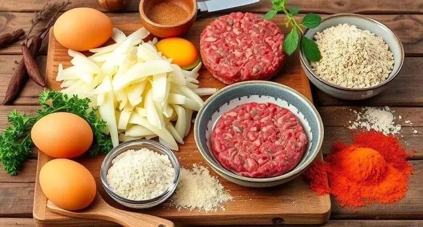 - Подготовьте фарш: в глубокой миске смешайте фарш, мелко нарезанный лук, яйцо, панировочные сухари, молоко, соль, перец и сушеный чеснок (если используете).