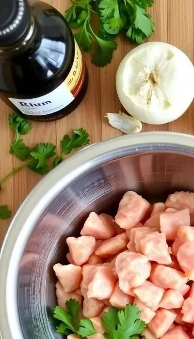 Ингредиенты: 500 г куриного фарша (идеально – смесь бедра и грудки для сочности), 1 крупная луковица, 2 столовые ложки светлого рома (например, Bacardi), 1 крупное яйцо, 3 столовые ложки панировочных сухарей (можно заменить на овсяные хлопья, измельченные в блендере), ½ чайной ложки соли, ¼ чайной ложки черного молотого перца, 1 столовая ложка растительного масла (для смазывания противня).
