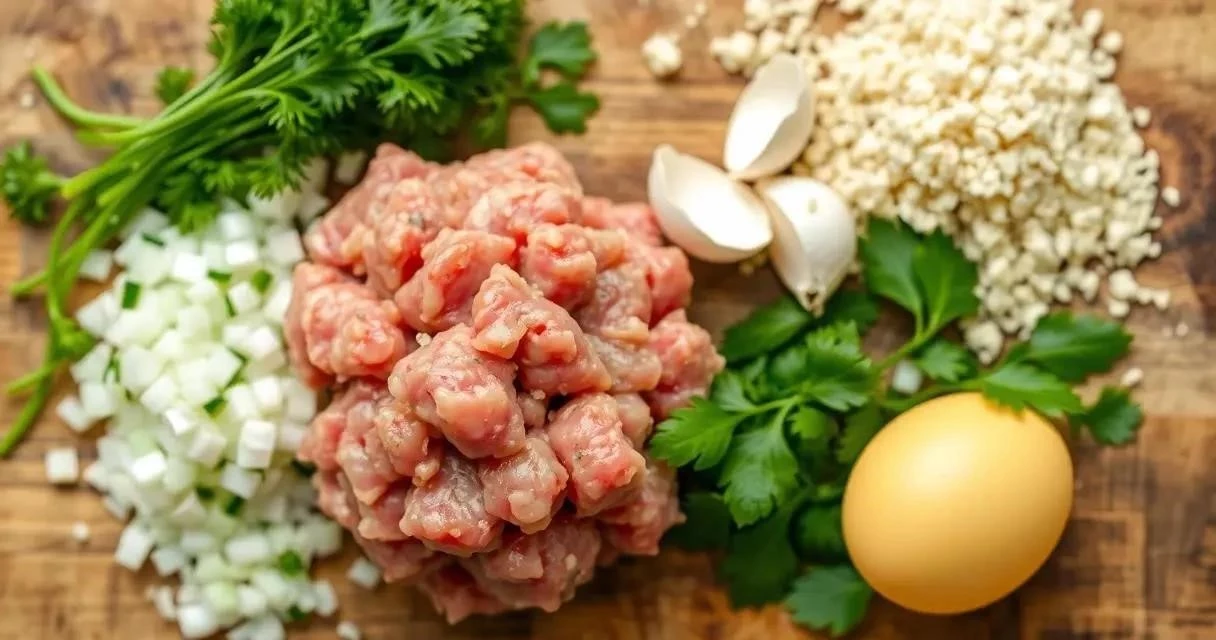 - В большой миске смешайте фарш, лук, чеснок, зелень, яйцо, панировочные сухари и молоко. Посолите и поперчите по вкусу.