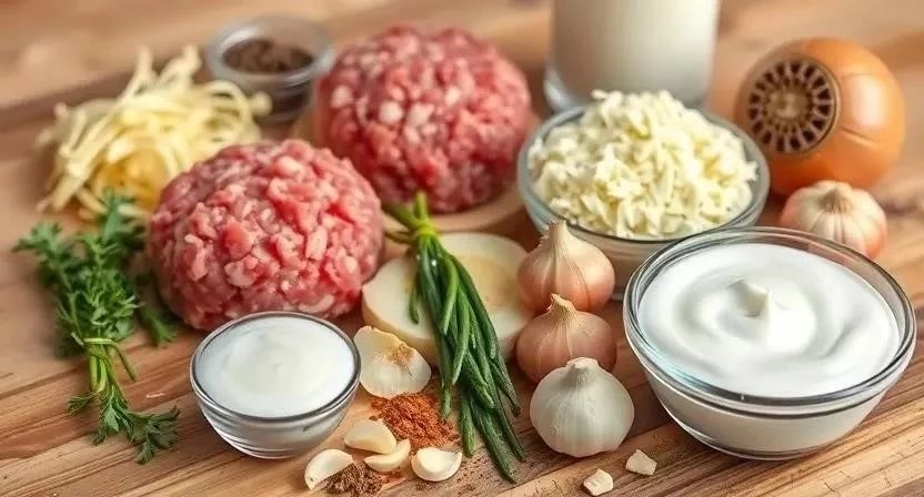 - Подготовьте фарш: смешайте говяжий фарш с мелко нарезанным луком, яйцом, панировочными сухарями, солью и перцем.