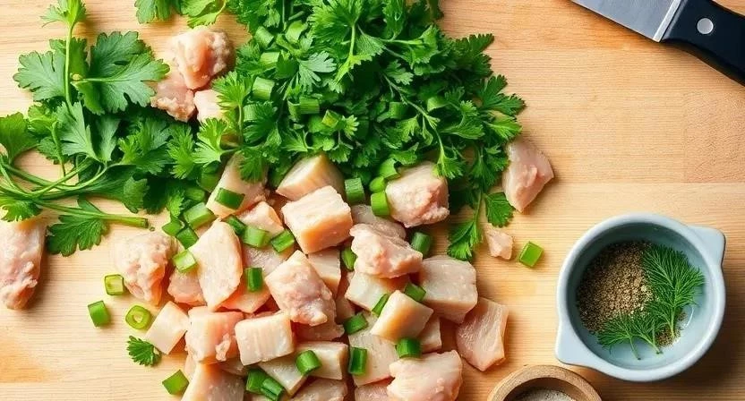 - Подготовьте фарш: смешайте куриный фарш, мелко нарезанный лук, яйцо, отварной рис, измельченную петрушку и укроп, соль, перец и чеснок (если используете).