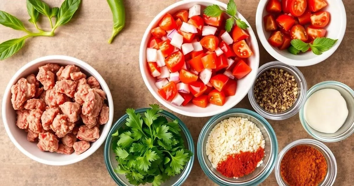 - В большой миске смешайте фарш, лук, чеснок, перец чили, помидор, кинзу, яйцо, панировочные сухари, кумин, кориандр, кайенский перец, соль и перец. Тщательно перемешайте все ингредиенты.