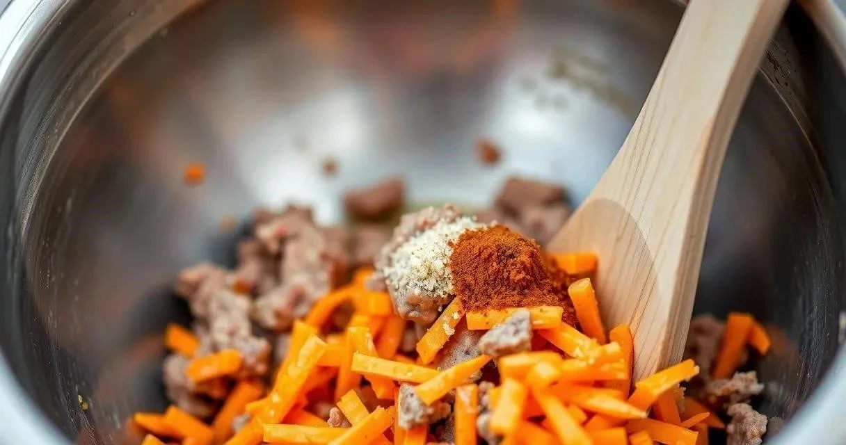 - В глубокой миске смешайте фарш, тертую морковь, обжаренный лук, яйцо, измельченный чеснок (если используете), манную крупу, соль, перец и специи.