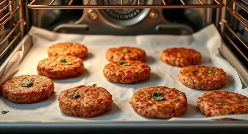 Установите температуру духовки 180°C и следите за котлетами, чтобы они не пересушились.