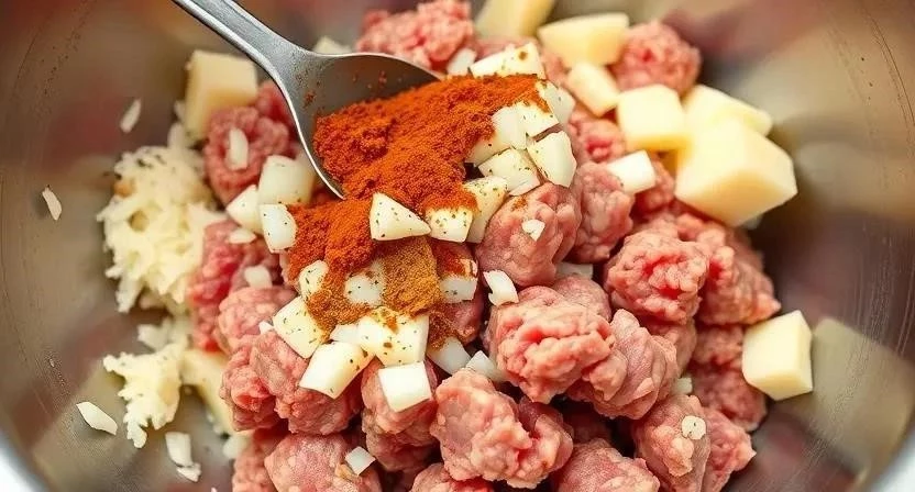 - Тщательно перемешайте фарш, чтобы все ингредиенты равномерно распределились.