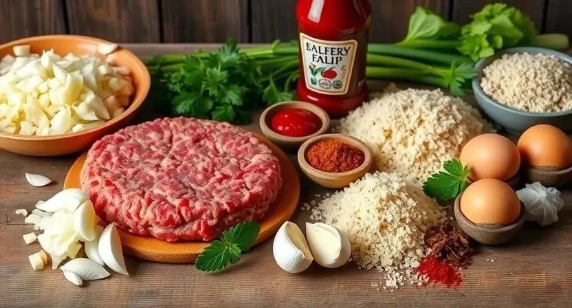 - Приготовление фарша: В большой миске смешайте фарш, размякший батон, лук, чеснок, яйцо, майонез, кетчуп, соль, перец и специи. Тщательно перемешайте до однородной массы.