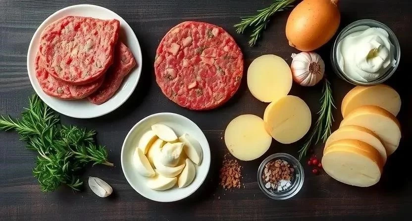 Для приготовления этого блюда нам понадобятся следующие ингредиенты. Я всегда стараюсь выбирать самые свежие и качественные продукты, ведь от этого напрямую зависит вкус готового блюда. Фарш из кабанятины можно приобрести в специализированных магазинах дичи или заказать у фермеров. Картофель для доффина лучше брать крахмалистых сортов.
