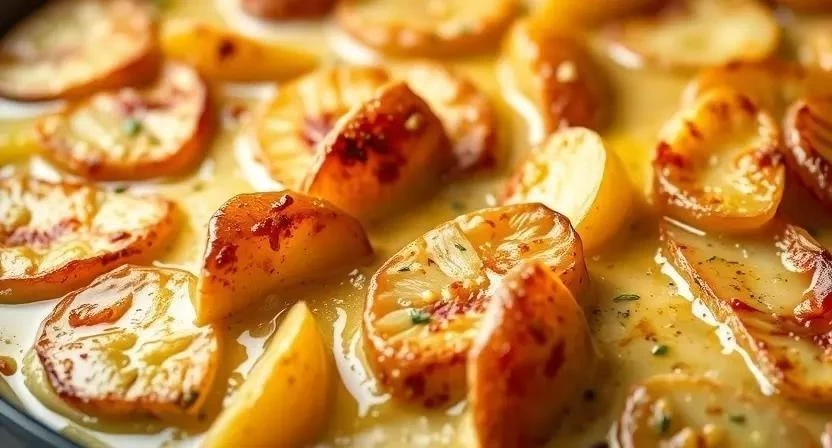 - Картофель выложить слоями в форму для запекания, заливая каждый слой сливочной смесью.
