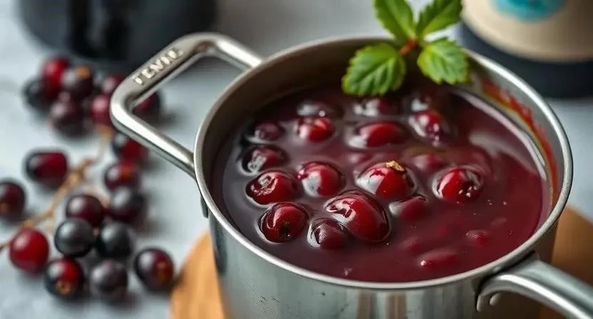 - Приготовьте соус: в сотейнике смешайте смородину, вино и сахар. Доведите до кипения и варите на медленном огне 10-15 минут, пока смородина не размягчится.