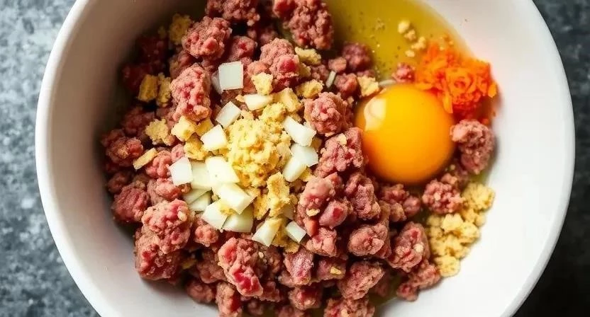 - В миске смешайте фарш, обжаренный лук, яйцо, панировочные сухари, горчицу, соль и перец. Тщательно перемешайте.