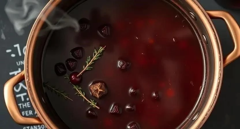 8. Влейте красное вино, добавьте раздавленные можжевеловые ягоды и веточки тимьяна. Доведите до кипения и тушите на медленном огне 10-15 минут, пока соус не загустеет.