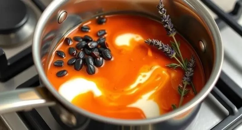 - В небольшой кастрюле смешать 200 мл сливок, 1 ст.л. сливочного масла, 1 ч.л. можжевельника и 1/2 ч.л. лаванды.