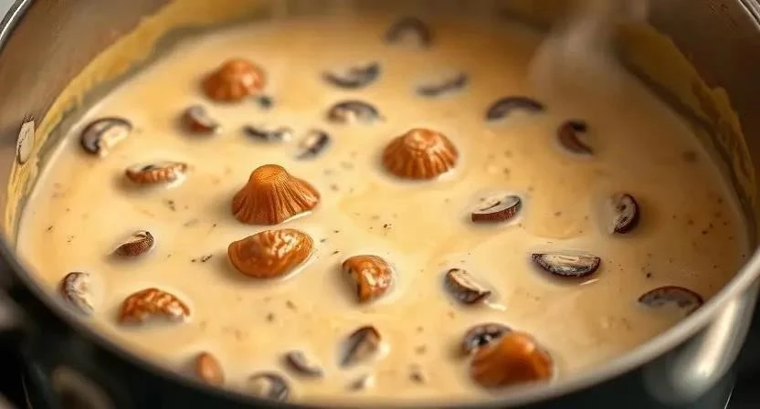 - Влейте бульон и сливки: постепенно влейте бульон и сливки, постоянно помешивая, чтобы не образовались комки. Доведите соус до кипения и убавьте огонь.