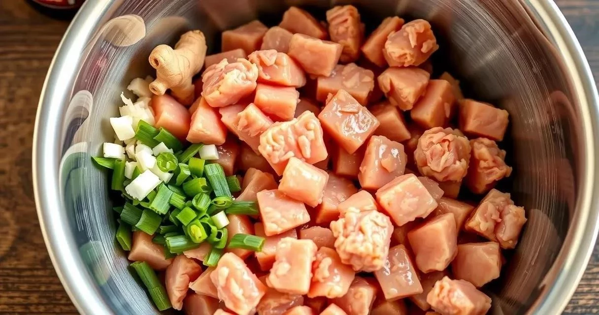 - В миске смешайте фарш, соевый соус, тертый имбирь, измельченный чеснок, нарезанный лук, яйцо, крахмал, кунжутное масло, соль и перец. Тщательно перемешайте.