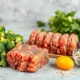 - Влажными руками отщипываем кусок мяса, формируем лепешку, в которую будем заворачивать начинку. Лепим, слегка прижимая, чтобы фарш не слишком плотно прилегал к белку. Это нужно для запаса на усадку мяса, которое при тепловой обработке сжимается и может давить на серединку.