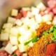 - Очистите луковицу от шелухи, мелко порежьте, добавьте в миску к остальным продуктам.