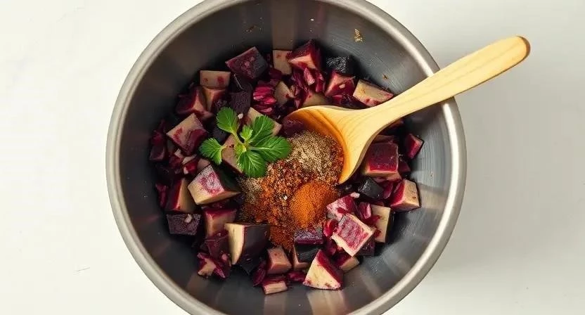 - В большой миске смешать тертую свеклу, измельченные баклажаны, обжаренный лук с чесноком, яйцо, муку, панировочные сухари, соль, перец и специи. Тщательно перемешать.