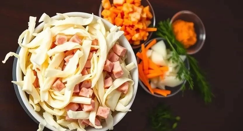 Если у вас нет ветчины, ее можно заменить куриным филе или шампиньонами. Все ингредиенты легко найти в любом супермаркете или на рынке. Капусту лучше выбирать плотную и свежую, а ветчину – качественную, без лишних добавок.