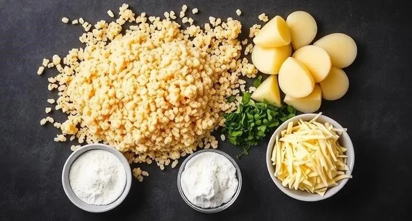 - Смешайте картофельное пюре, киноа, тертый сыр, яйцо, муку, соль, перец и чесночный порошок. Тщательно перемешайте.