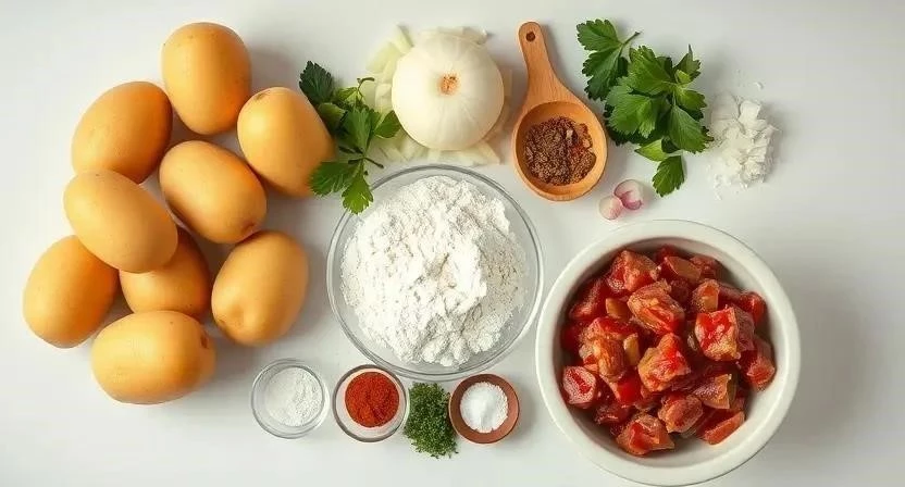 Для приготовления этих вкуснейших картофельных котлет нам понадобятся простые и доступные ингредиенты. Я обычно покупаю все необходимое в ближайшем супермаркете, но свежие овощи лучше брать на рынке.