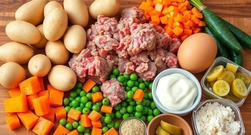 - Для оливье: картофель, морковь, яйца, соленые огурцы, зеленый горошек, колбаса вареная, майонез