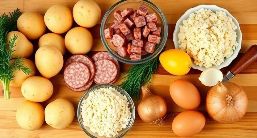 Для приготовления вкусных картофельных котлет с сосисками нам понадобятся следующие ингредиенты: