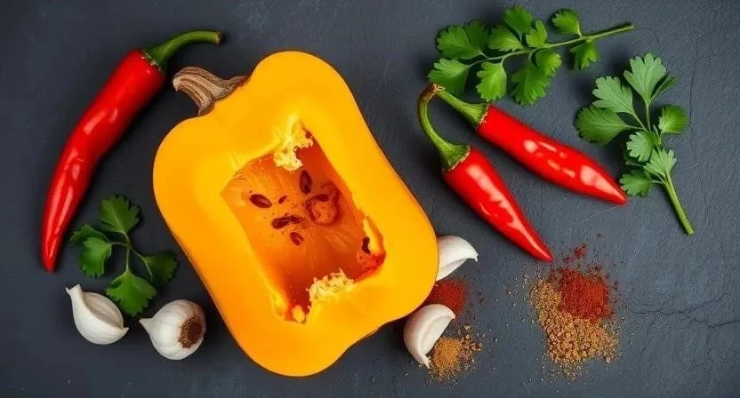 Тыква – кладезь витаминов и полезных веществ. Она содержит витамины А, С, Е, К, витамины группы В, калий, магний, железо и другие микроэлементы. Тыква обладает противовоспалительными, антиоксидантными и иммуностимулирующими свойствами. Острый перец также полезен для здоровья. Он содержит витамин С, капсаицин и другие вещества, которые улучшают кровообращение, ускоряют метаболизм и укрепляют иммунитет.