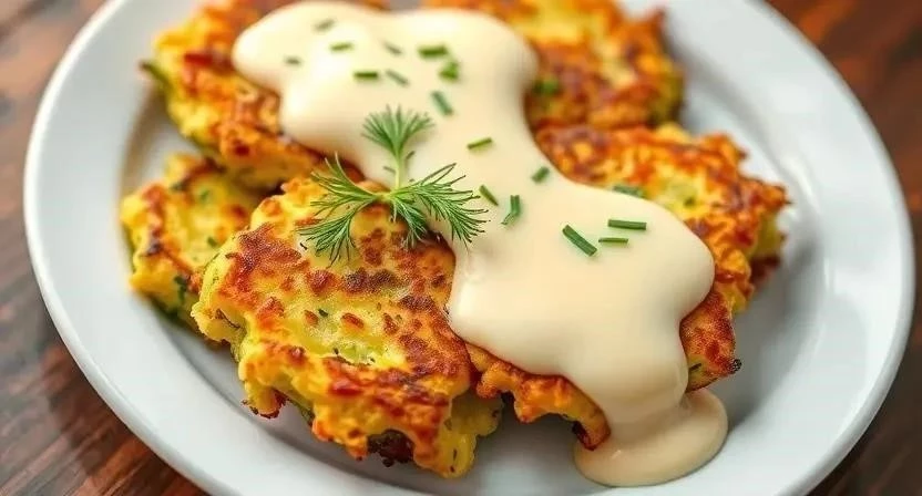- Подавайте кабачковые котлеты горячими, полив их сырным соусом.